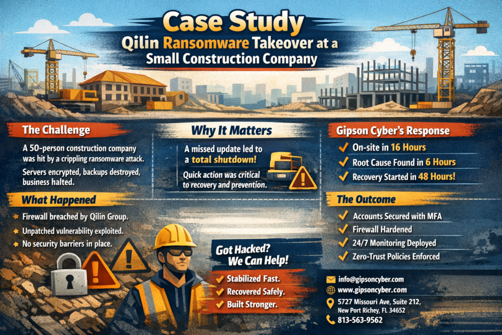 A 50-person construction company experienced a sudden, company-wide ransomware attack that halted business operations. Core servers and virtual machines were encrypted, administrator access was lost, and backups were rendered unusable.